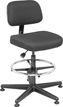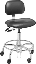 To prevent static buildup, these adjustable-height stools have a brass drag chain to ground electrical charges. They are often used in electronics assembly to help protect sensitive equipment from damage. A backrest provides support and promotes good posture to reduce back strain. Use the lever under the seat to adjust the height; the air cylinder controls the movement for a quick, smooth adjustment. All swivel so that you can work on multiple surfaces without having to stand up.