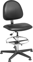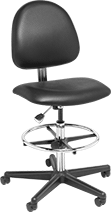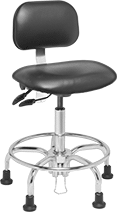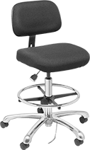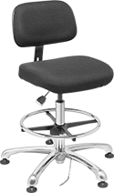 To prevent static buildup, these adjustable-height chairs have a brass drag chain to ground electrical charges. They are often used in electronics assembly to help protect sensitive equipment from damage. With a surface resistivity of 108 ohms/sq., they divert static quickly.