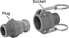 Made of metal, these couplings have better durability than plastic cam-and-groove couplings. A complete coupling consists of a plug and a socket (both sold separately) that allow you to quickly connect and disconnect medium-to large-diameter hose lines. To connect, insert the plug into the socket and press the levers down. The levers fit snugly into the groove on the plug’s body and force the plug against the gasket to form a tight seal. To disconnect, lift both levers and pull out the plug. Couplings are compatible with Andrews, Dixon, Ever-Tite, and PT cam-and-groove couplings.