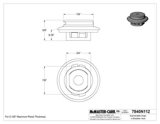 No threaded hole or tools needed—snap these vents into enclosures with a maximum 1/8” panel thickness to let airflow in and keep water out even when submerged. Use them to maintain consistent pressure inside your enclosure as temperatures change. These vents have a pressure compensating seal that prevents pressure buildup. They also have an acrylic filter that resists dust, water, and oil.