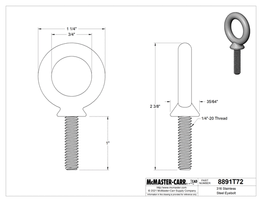 with Shoulder-for Lifting, 1/4"-20 Thread Size, 1" Thread Length