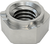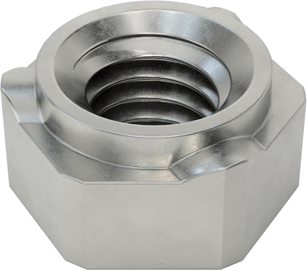 Prevent screws from backing out under heavy vibration. These nuts have distorted threads that grip screws tightly. Three evenly spaced projections concentrate heat away from the threads to prevent them from deforming and create consistent welds. These nuts also have a collar pilot that guides the nut into the hole, holds it in place while welding, and protects the threads from weld spatter.