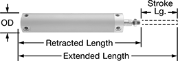 | Stroke | Retracted | Extended | Force @ 100 psi, lbs. | Body Material | Thread Size | Thread Type | Gender | Each | |