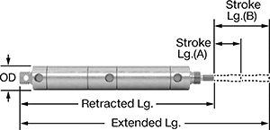 | Stroke (A) | Stroke (B) | Retracted | Extended | Force @ 100 psi, lbs. | Body Material | Thread Size | Thread Type | Gender | Features | Each | |
