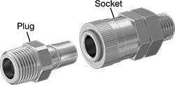 Sockets have a shut-off valve that stops the flow when the coupling is separated, so air won’t leak from the line. They are push-to-connect style. To connect, push the plug into the socket until you hear a click. To disconnect, twist the sleeve on the socket and pull out the plug. This twist-to-disconnect feature reduces the chance of accidental disconnection.