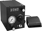 Reduce fatigue by using pressure from your air compressor to dispense viscous fluids. These dispensers are especially useful for adhesives that are too thick and sticky to push out with the force of your thumb. Simply step down on the foot pedal for as long as you want to dispense out of the syringe barrel (sold separately for some dispensers). All have an air pressure control knob you can adjust to change the flow, depending on your material and the amount you want to dispense. Since you operate these dispensers with your foot, you’ll have both hands free to position the syringe barrel and make adjustments.
