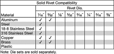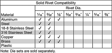 A die set (sold separately) is required and must be attached to the tool jaws to properly form rivets during installation. Choose a die set that matches the rivet's head style.