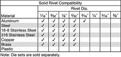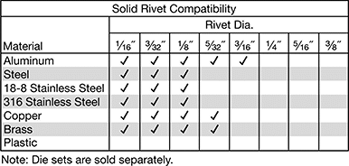 A die set (sold separately) is required and must be attached to the tool jaws to properly form rivets during installation. Choose a die set that matches the rivet's head style.