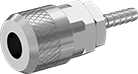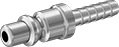 Plugs and sockets with a barbed end insert into plastic or rubber hose and secure with a clamp or a crimp-on hose ferrule.