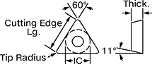 | Insert Code | Inscribed Circle Diameter (IC) | Thick. | Cutting Edge Lg. | Tip Radius | For Tool Bit Code | Each | Pkg. Qty. | Pkg. | ||