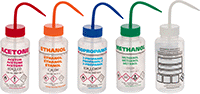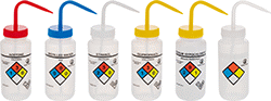 Labels allow identification at a glance. These bottles are also known as wash bottles and dispense liquid at a downward angle. For dispensing only; not recommended for storage.