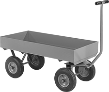 The platforms on these wagons have a 6" high lip to contain loose material. They have fifth-wheel steering with pivoting front wheels and axle for easy maneuverability and tight turning under heavy loads. Handles stay upright, even when not being pulled, to limit bending.