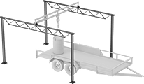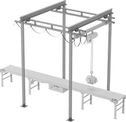 Position your load anywhere inside the four posts of these cranes. Originally designed to service vehicles, these cranes offer the flexibility of overhead bridge cranes without requiring ceiling installation. They include two fixed beams, a moving beam that travels along them, a trolley, and four posts. The tracks are enclosed to keep debris from collecting.