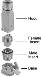 Configure a connector for your application—combine male and female inserts with a base and a hood. Select components based on the number of poles needed. To protect connections while maintaining access, the base and hood latch together securely, yet can be quickly detached for equipment repair or replacement. Once assembled, these connectors are rated NEMA 4X, 12, and IP65 for protection against corrosion, washdowns, dirt, oil/coolant dripping, and water projected from a nozzle.