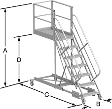 | Ht. (A) | Wd. (B) | Dp. (C) | Ht. (D) | Wd. (E) | Dp. (F) | Max. Climbing Ht. | No. of Steps | Cap., lbs. | Overhang Dp. | Ground Clearance Ht. | Color | Wheel Configuration | Assembled or Unassembled | Specifications Met | Each | Each | Each | |||