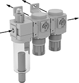 Connect two or more of these manifold regulators to meet multiple pressure requirements from a single air supply—set a different output pressure with each regulator. Use joiner clamps (sold separately) to connect them to other SMC units of the same series, so you can customize your air preparation system. These regulators come with one regulated outlet on their back and one unregulated outlet. All are relieving regulators, so they exhaust when the downstream pressure exceeds the set pressure. Install them in your air line after filters.