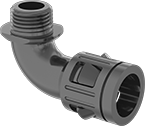 Tabs on one end snap into grooves in conduit; the other end attaches to a knockout in an outlet box or enclosure. These adapters help seal out air and liquid when used with flexible plastic conduit. All meet IP68 for prolonged submersion and IP69K for high-pressure, high-temperature washdowns. They withstand vibration, are flame retardant, and resist oil, solvents, and UV light.
