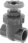 For a permanent, leak-tight seal, insert unthreaded pipe into the socket ends on these valves and bond with primer and cement. To withstand aggressive and corrosive solutions in chemical-processing applications, they have a fluoroelastomer seal and a plastic body. All gradually open and close with multiple turns of the wheel handle to prevent system damage from suddenly starting and stopping flow. Valves have a nonrising stem that stays in the same position whether the valve is open or closed.