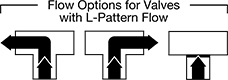 Valves with L-pattern flow direct flow from the bottom-port inlet to either side-port outlet or shut off flow completely.