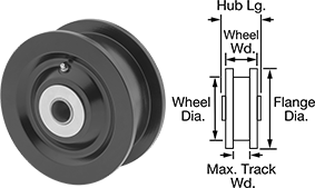 A flange on one or both sides of the wheel keeps your equipment running on rails and square structural tubing. Wheels have roller bearings for smooth rolling.