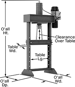 | Cap., lbs. | Max. Stroke Lg. | Throat Dp. | Clearance Over Base | Material | Dia. | Press Ht. | Frame Material | Lg. | Wd. | Includes | Each | |