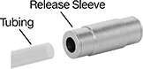 Fittings are 316 stainless steel, which has excellent chemical resistance and is more durable than plastic. Also known as instant fittings, they connect to tubing with a push, and an internal gripping ring and O-ring hold the tubing tight. Instead of a release ring, these fittings have a release sleeve that slides back to disconnect tubing.