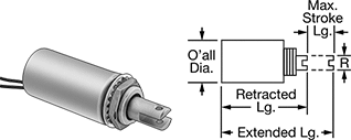Max. Stroke Lg. | Retracted | Extended | Retracted | Extended | Force @ 100% Stroke Lg., oz. | Choose a Voltage | Power Draw, Watts | On/Off Time, Seconds | Dia. | Lg. | Rod Dia. (R) | Each | |