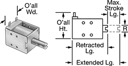 Max. Stroke Lg. | Retracted | Extended | Overall | Force @ 50% Stroke Lg., oz. | Choose a Voltage | Power Draw, Watts | On/Off Time, Minutes | Dia. | Wd. | Ht. | Rod Dia. (R) | Each | |