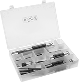 | 150 | 18 | 150 extension springs in music-wire steel and spring-tempered steel, in sizes ranging from 1"-4" lg., 0.141"-0.5" OD, and 0.016"-0.062" wire dia. | Plastic Box | 0000000 | 000000 |