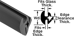 Fits Edge Thick. | Wd. | Fits Glass Thick. | Edge Clearance Thick. | Grip Material | Hardness | Hardness Rating | Bend Radius | Temp. Range, °F | For Use Outdoors | Color | Lengths, ft. | 1-99 | 100-Up | ||