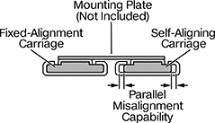 Carriages for axial/parallel rail misalignment compensate when the rails aren’t installed at the same exact height and also when one rail is straight while the other is installed at a slight angle.