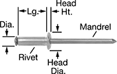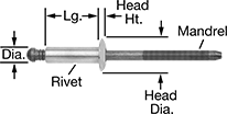 Lightweight and nonmagnetic, these rivets have good corrosion resistance. The mandrel expands the body of these rivets to completely fill the hole, providing the highest shear and tensile strengths of all the blind rivets we offer. The portion of the mandrel that's retained inside the rivet after installation won't loosen over time and fall out. Use blind rivets to fasten material when you only have access to one side. A low-profile domed head creates a finished appearance.