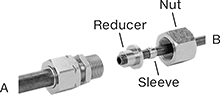 To connect a compression fitting to a smaller tube, place the reducer in the fitting, then slide the nut and sleeve onto the tube. Push the smaller tube into the fitting until it butts against the back of the reducer. Tighten the nut onto the fitting to compress the sleeve.