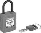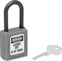 The lock body is plastic, so it resists corrosion and won’t scratch nearby surfaces. A nylon coating on the shackle also prevents scuffs and scrapes. These locks are key retaining, so you can’t remove the key from the lock until the shackle is closed. This reduces risk in lockout applications because your lock must be properly secured before you walk away with the key. Choose these locks if you need several locks that open with the same key.