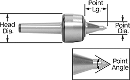 Morse Taper Number | Max. Workpiece Cap., lbs. | Max. Speed, rpm | TIR (Total Indicated Runout) Accuracy | Point Dia. | Head Dia. | Point Lg. | Overall Lg. | Point Angle | Material | Each | |