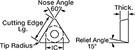 | Insert Code | Inscribed Circle Dia. (IC) | Tip Radius | Thick. | Cutting Edge Lg. | Rake Type | For Cutting Operation | Finish | Each | |