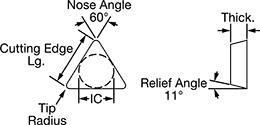 | Insert Code | Type | Shape | Angle | Threads Per Inch Range | Inscribed Circle Dia. (IC) | Thick. | Tip Radius | Finish | Pkg. Qty. | Pkg. | |