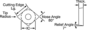 Insert Code | Inscribed Circle Dia. (IC) | Tip Radius | Thick. | Cutting Edge Lg. | Rake Type | For Cutting Operation | Finish | Features | Each | Pkg. Qty. | Pkg. | ||