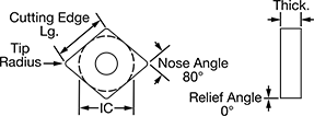 | Insert Code | Inscribed Circle Dia. (IC) | Tip Radius | Thick. | Cutting Edge Lg. | Rake Type | For Cutting Operation | Finish | Pkg. Qty. | Pkg. | |