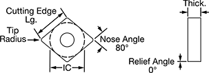 | Insert Code | Inscribed Circle Dia. (IC) | Tip Radius | Thick. | Cutting Edge Lg. | Rake Type | For Cutting Operation | Finish | Features | Each | Pkg. Qty. | Pkg. | ||