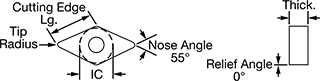 | Insert Code | Inscribed Circle Dia. (IC) | Tip Radius | Thick. | Cutting Edge Lg. | Rake Type | For Cutting Operation | Finish | Each | |