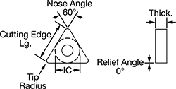 | Insert Code | Inscribed Circle Dia. (IC) | Tip Radius | Thick. | Cutting Edge Lg. | Rake Type | For Cutting Operation | Finish | Pkg. Qty. | Pkg. | |