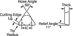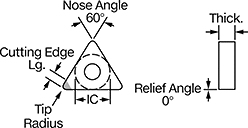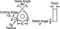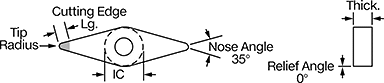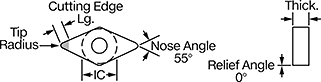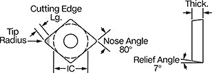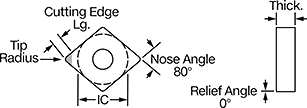 | Insert Code | Tip Radius | Inscribed Circle Dia. (IC) | Thick. | Cutting Edge Lg. | Rake Type | For Cutting Operation | Finish | Each | |