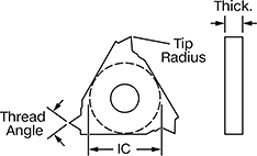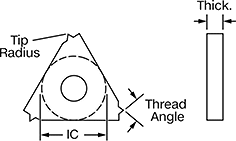 | Insert Code | Type | Shape | Angle | Threads Per Inch | Thread Pitch, mm | Inscribed Circle Dia. (IC) | Thick. | Tip Radius | Material | Material Grade | Finish | For Use On | Each | |
