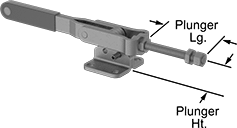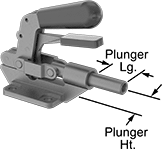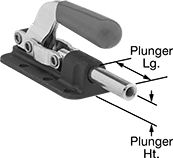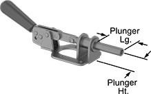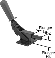 The handle can be rotated 125° for easier access or extra clearance above the clamp. These clamps secure when the plunger is fully extended to hold a workpiece from the side. The plunger is internally threaded to accommodate threaded holding screws and other threaded fixtures (not included).