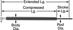 Extended Lg. | Compressed Lg. | Stroke Lg. | Extension Force, lbs. | Compression Force, lbs. | Dia. | Sleeve Dia. | Dia. | Thread Size | Removable End Fittings | End Thread Size | Lg. | Thread Lg. | Thread Size | Temperature Range, ° F | Each | |