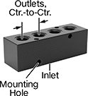 Unlike other manifolds, which have an inlet on either end, these have one inlet on the opposite side from the outlets. This design allows fluid or air to follow a straight path, improving flow through your system. It also frees up the ends of the manifold, so you can mount it in corners and in narrow spaces. Manifolds are also known as headers. They have mounting holes, so you can mount from the top or side.