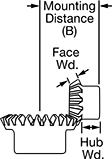 Face Wd. | Gear Pitch | Pressure Angle | Speed Ratio | Number of Teeth | Gear Pitch Dia. | OD | Overall Wd. | For Shaft Dia. | Mounting Distance (B) | Dia. | Wd. | Material | Each | |