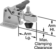 Push the lever to lock the handle and prevent accidental opening. Often used when assembling small parts, these small clamps have the holding strength of a full-size clamp. They have an open arm, so you can move the holding screw to any position along the arm. To achieve maximum holding capacity, position the screw closest to the base. Capacity decreases by as much as 30% when the screw is positioned at the end of the arm.