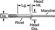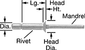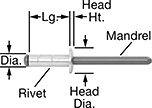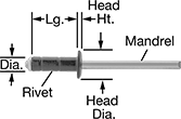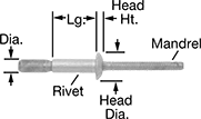 Dia. | For Material Thick. | Lg. | For Hole Size | For Drill Bit Size | Head Dia. | Head Ht. | Shear Strength, lbs. | Tensile Strength, lbs. | Pkg. Qty. | Pkg. | |